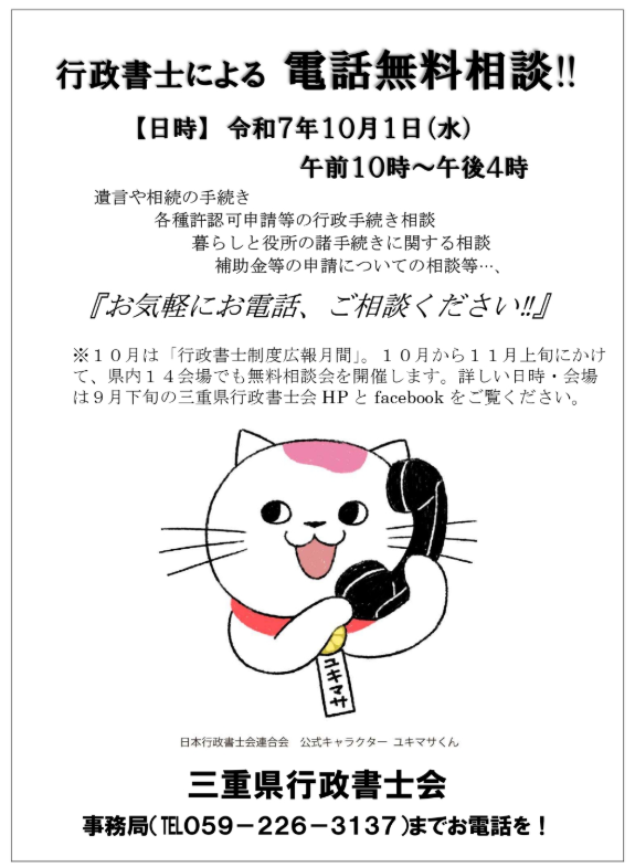 三重県行政書士会では、10月1日(水)の「電話無料相談会」をはじめ、広報月間中、県内各地で「行政書士による無料相談会」を開催いたします。